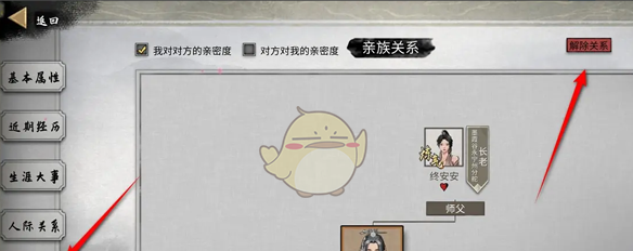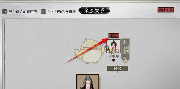 3.解除关系操作:进入亲族关系页面后,点击右上角的“解除关系”按钮,系统将展示您与师傅或徒弟的关系列表。