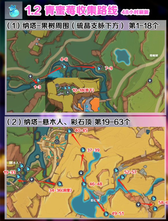 获取方式:作为纳塔地区的特产,青蜜莓可在野外采集。主要采集点包括:硫晶支脉右下方、隆崛坡左方、族遗庙宇左方,彩石顶附近。