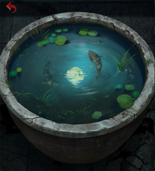 交出阴阳玉佩,换取一包鱼饲料。将鱼饲料撒进大缸中,出现月亮影子,用勺子挖出黄珠子。