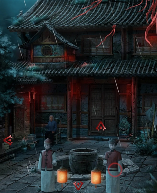 在卧室桌子上得到胶带,花盆里获得土块。在梳妆台上获取毛笔,篮子里得到剪刀。用剪刀剪掉走廊里被封印的门上的红线,用石头打掉三个八卦镜(玩小游戏)。用胶带将门口的黄纸碎片粘上,打开房间。