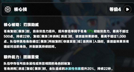 3.苍角:释放展旗提升全队攻击力和冰属性伤害,为主C角色传递增益。