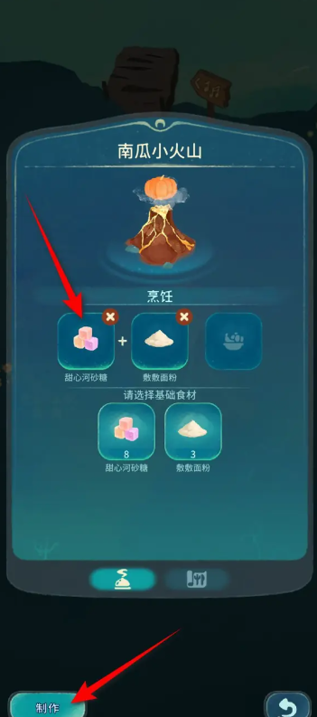在南瓜小火山内部,找到并选择“甜心河砂糖”和“敷敷面粉”。