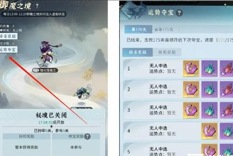 积极参与运势夺宝:在御魔之境活动中,特别关注运势夺宝玩法。手动参与夺宝可获得仙玉、观星图等奖励,提升资源获取效率。