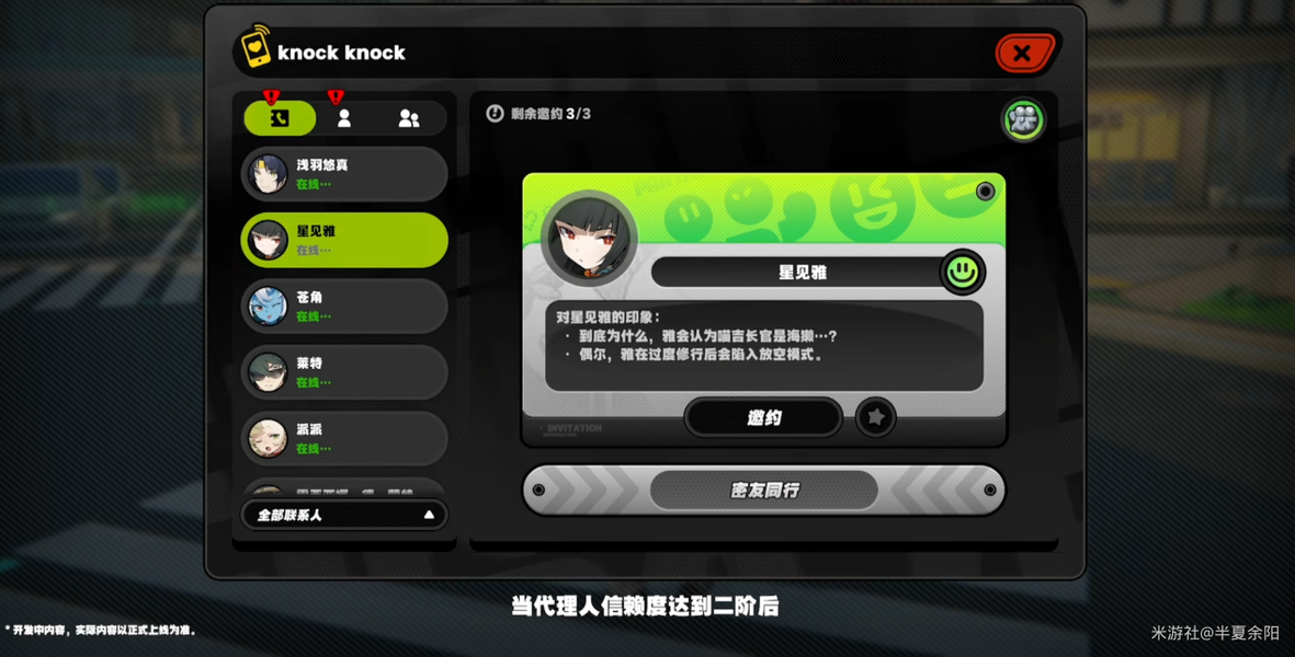 在密友同行模式中,玩家每次最多只能邀请一名代理人共同行动。这一设定旨在增强玩家与单个代理人的互动深度。