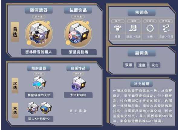 词条选择:躯干选暴击伤害,脚部选速度和攻击力,连结绳选攻击力,位面球选冰元素伤害加成。