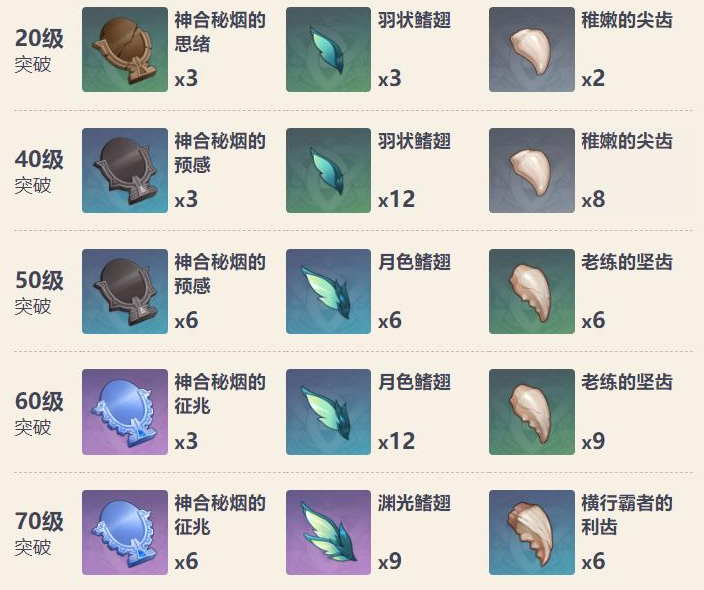 碎链的突破材料包括神合秘烟系列的多种思绪、预感、征兆及启示,以及羽状鳍翅、月色鳍翅、渊光鳍翅和稚嫩的尖齿、老练的坚齿、横行霸者的利齿。这些材料丰富了碎链的突破过程,提升了其整体属性。