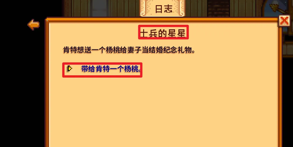 信中,他满怀期待地请求你帮忙准备一份特别的礼物——杨桃,以表达他对妻子的结婚纪念日的感情。此时,你的日志中会新增“士兵的星星”任务,点击接受。