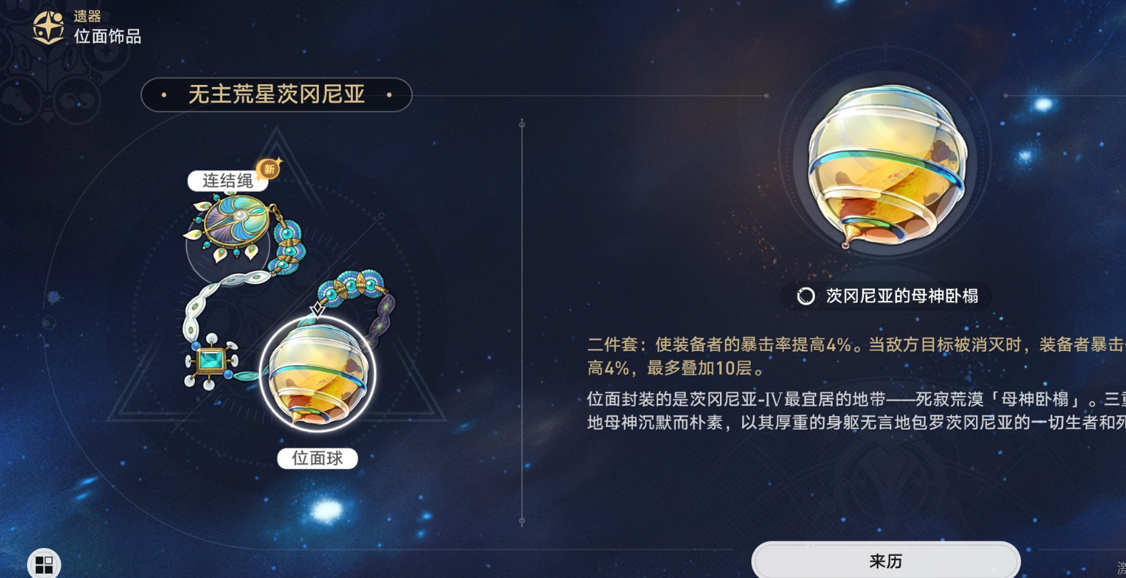 二件套直接提升4%的暴击率,四件套则在击杀敌人后增加20%的暴击伤害,持续3回合。这有助于大黑塔在连续战斗中保持高输出。若难以获取,可考虑其他提供暴击率、暴击伤害或攻击力的内圈遗器。