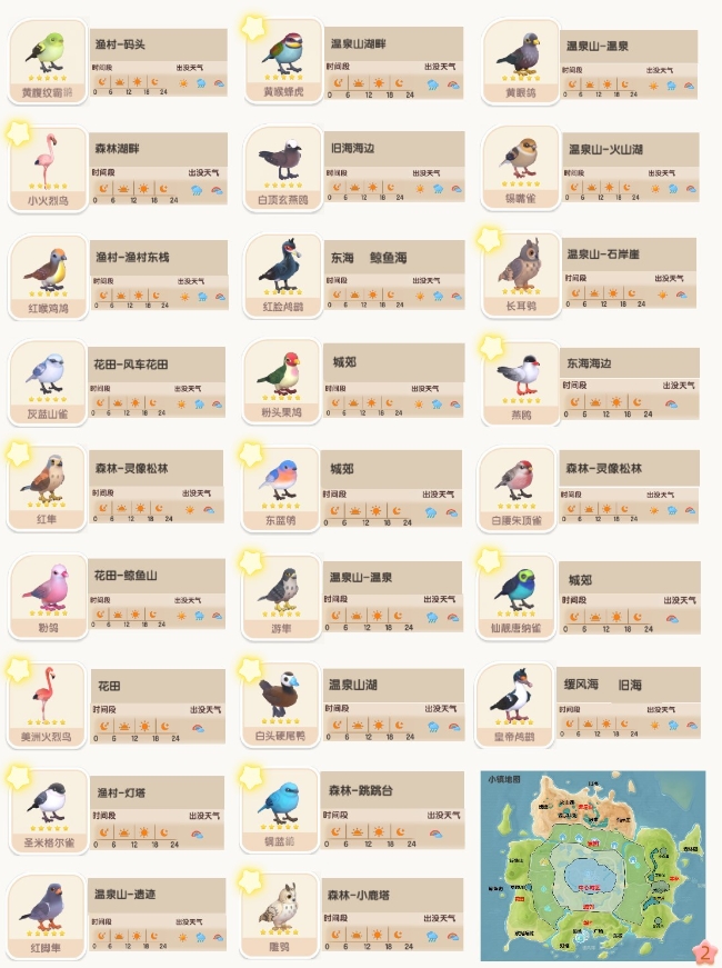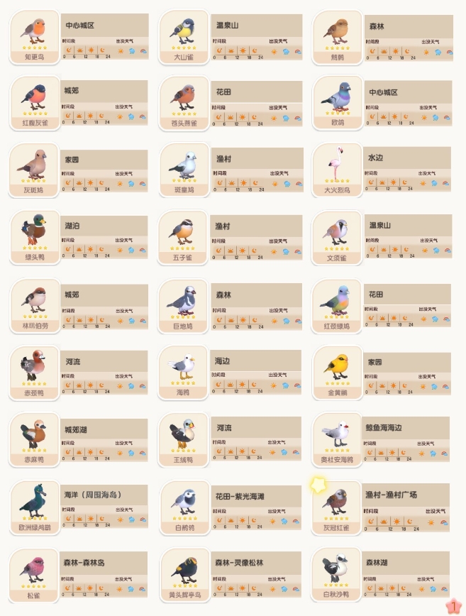 心动小镇的观鸟玩法中,玩家们需要对游戏里面的各种鸟类进行拍照,鸟类的种类非常的多,每一种鸟类出现的时间和地点也不一样,如果你想了解这些鸟类出没的时间和地点,那就给大家来一一讲解。