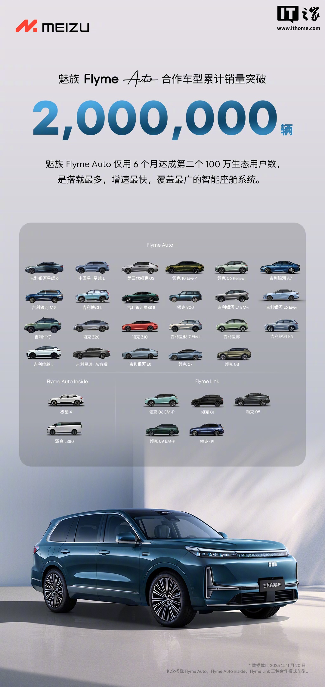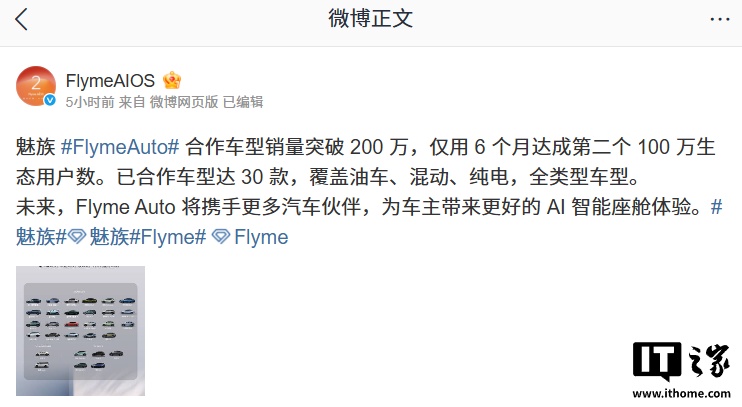 11 月 21 日消息,魅族 FlymeAIOS 官方今日宣布:FlymeAuto 合作车型销量突破 200 万。目前,Flyme Auto 的合作车型达 30 款,覆盖油车、混动、纯电,全类型车型。