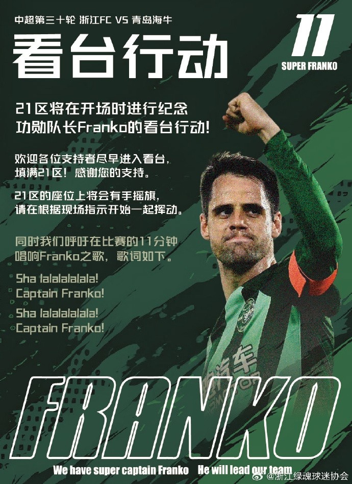 直播吧11月21日讯 中超收官战,浙江队将对阵青岛海牛。赛前,浙江绿魂球迷协会发布“11.22看台行动公告”致敬功勋队长弗兰克。
