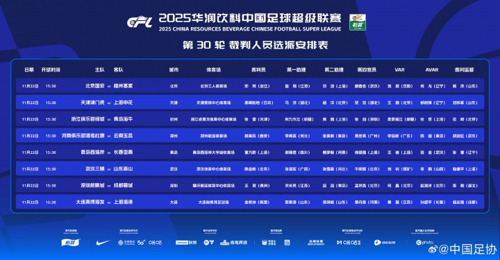 中超末轮今天下午15:30开战,官方目前仍未公布裁判员安排