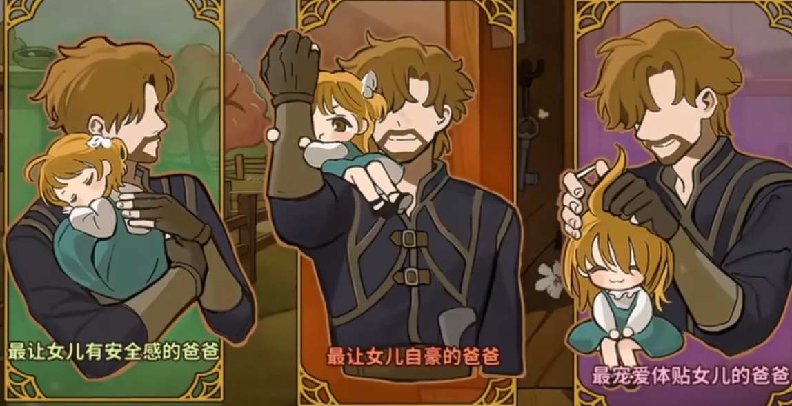 在游戏的初期阶段,玩家将可以选择三种不同的父亲角色:安全感型的父亲可提升你的博学与善良技能,分别增加;自豪型的父亲则加强你的厉害与善良能力,同样增加;体贴型的父亲为你带来温柔与善良属性上的提升,同样达到。每种风格都强调了善良的重要性,建议根据自己的偏好进行选择。