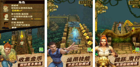 这款游戏以幽邃古老的神庙为灵感背景,结合了自动前行的跑酷机制。角色在一条无尽延伸的路上不断奔跑,沿途会遇到树根、断桥等障碍物,需要通过跳跃或滑行灵活避开。同时,在道路两侧散布着大量的金币,收集后可用于解锁新角色或提升装备水平,让玩家体验紧张刺激的游戏节奏,无法自拔地陷入其中。