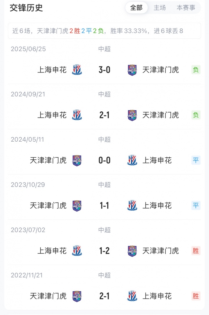 中超29轮过后,天津津门虎12胜8平9负积44分排在第6;上海申花18胜7平4负积61分排在第2。