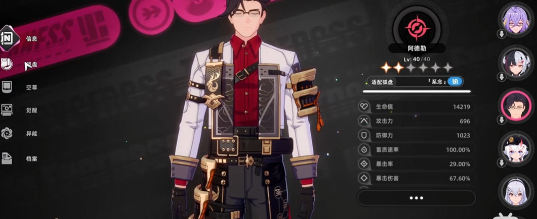 另一位值得关注的是阿德勒,他定位为咒系防护型辅助。他的技能为全队施加护盾保护,尤其搭配系念属性的弧盘时效果更佳,非常适合配合雨人体系使用。合理配置卡带可以进一步强化其护盾强度,并提升队友的攻击力。他的E技能可为全队提供基于防御倍率的护盾,大招则具备多段打击能力,在输出的同时强化团队防护,实用性广泛,适用于多种战斗场景。