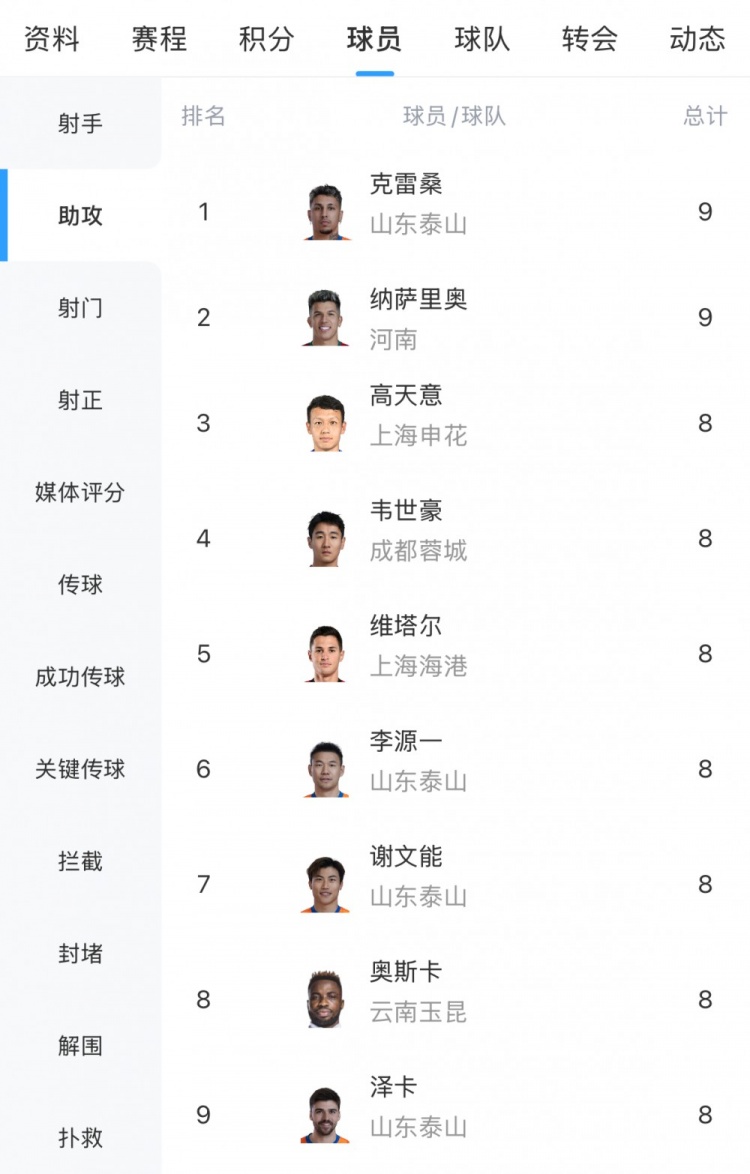 直播吧11月22日讯 2025年赛季中超联赛落下帷幕,在助攻榜方面,克雷桑和纳萨里奥9次并列第一。