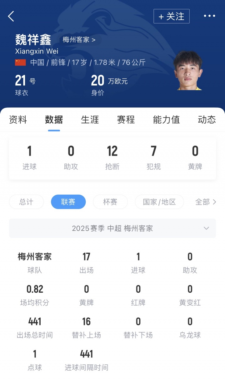 直播吧11月23日讯 官方消息,17岁梅州客家前锋魏祥鑫加盟法甲欧塞尔。