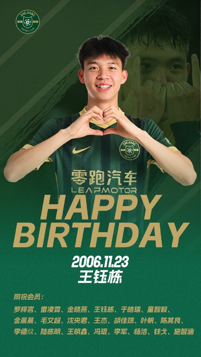 直播吧11月23日讯 今天是王钰栋19岁生日,浙江队官方发文送祝福。