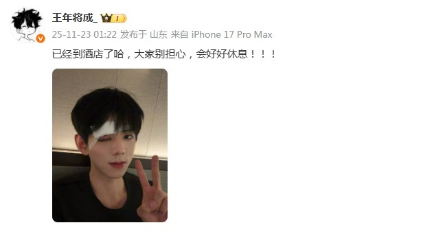 事情发生后,王年将成在今天凌晨更新微博,向外界报平安,表示“已经到酒店了哈,大家别担心,会好好休息”。照片中可以清晰看到,王年将成的眼眶出现红肿,眉骨也已被包扎起来。