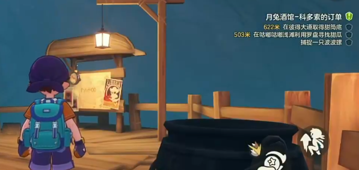 在月兔酒馆捕捉完成后,将之前获得的好甜筒和甜瓜递给厨师弗格尔,并加入波波螺到队伍中。接着,在厨房的水炉处投掷波波螺进行料理加工。食物制作过程至此完成,顾客科多索会立即出现并与你对话,随后提交菜品,最后执行一次鞠躬动作,即可获得任务奖励。