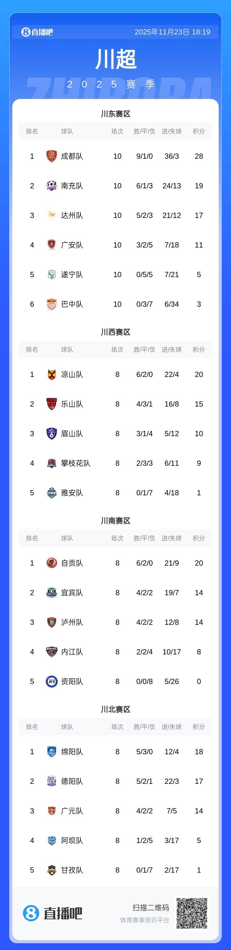 直播吧11月23日讯 川超联赛第一阶段分区赛结束,4个赛区共有9支球队晋级总决赛。