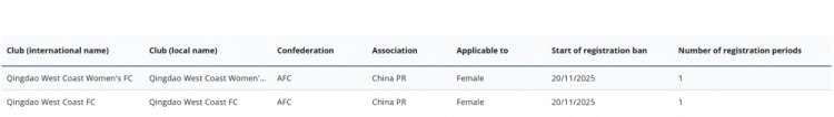 直播吧11月24日讯 根据国际足联官方信息,青岛西海岸新增两条女足转会禁令。