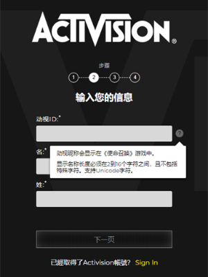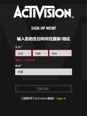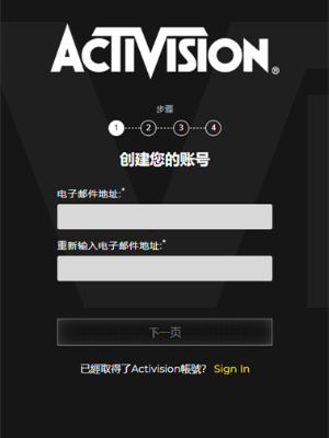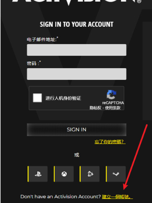 1、点击使命召唤战区官网的入口链接进入动视的网站,打开动视账号的登录界面,点击最下方的【建立一个账号】按钮。