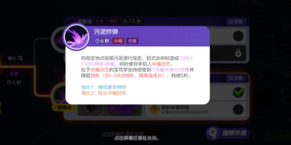 向指定地点投掷污泥进行攻击,招式命中时造成100(+150%特攻)伤害,同时使对手陷入中毒状态。处于中需状态的宝可梦会持续受到(1%最大体力)伤害井降低特防(30~58点特防,随等级成长),持续5秒。