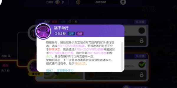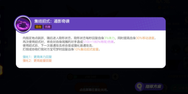 隐藏身形,随后现身于指定地点对范围内的对手进行攻击,造成85(+125%特攻)伤害。若被攻击的对手正处于异常状态,则会造成170(+250%特攻)伤害并追加对手8%已损失体力伤害,同时回复80(+60%6特攻)自身体力,并且在8秒内可以再次使用一次。