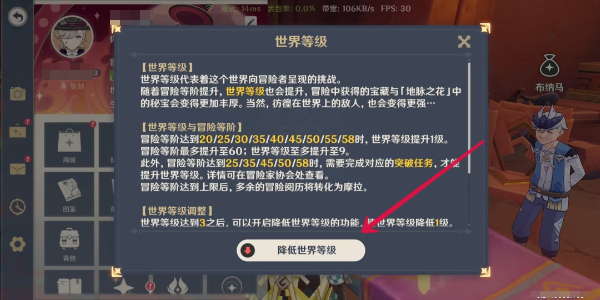 点击左上角的派蒙图标就会弹出菜单,在菜单页面我们点击世界等级后方的感叹号,在弹出的窗口中点击【降低世界等级】即可降低我们的大世界等级。