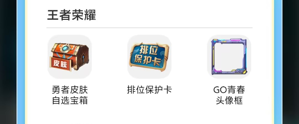 勇者自选宝箱、排位保护卡、GO青春头像框。
