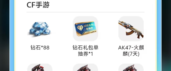 钻石*88、钻石礼包单抽劵*1、AK47-火麒麟(7天)、黑武器手雷(7天)、黑武器烟雾弹(7天)、黑武器闪光弹(7天)。