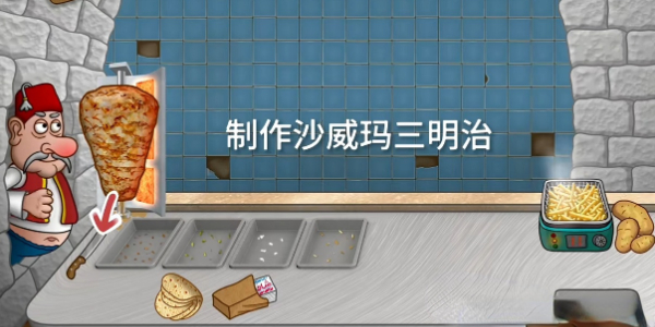 1、当进入游戏后发现餐馆左侧托盘中装的是烤肉,当烤肉不够时,就需要切烤肉。