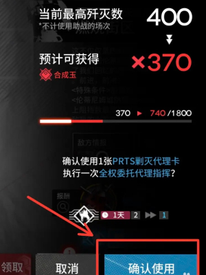 在剿灭作战中使用PRTS剿灭代理卡即可激活全权委托代理指挥功能,可以跳过作战记录并且以该剿灭无助战时的最高歼灭数计算报酬。
