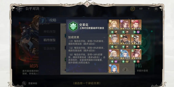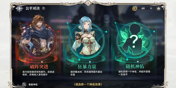 挑战开启时,传承者可以选择魂师神佑,不同的神佑包含不同的强力增益效果,并根据传承者所选择的神佑生成对应的初始魂师。