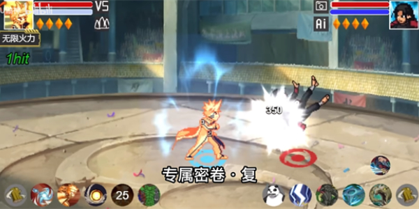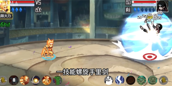 鸣人召唤九喇嘛使用尾兽弹自身使用螺旋手里剑,造成大范围的爆炸伤害。