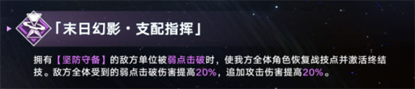 拥有【坚防守备】的敌方单位被弱点击破时,使我方全体角色恢复战技点并激活终结技。敌方全体受到的弱点击破伤害提高20%,追加攻击伤害提高20%。