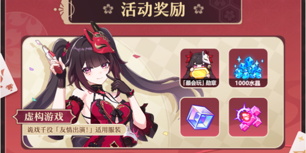 参与活动可获取诡戏千役「友情出演!」全新服装「虚构游戏」、「最会玩」勋章、水晶、根源棱镜等奖励,通关活动玩法,最多可获得水晶×1000!