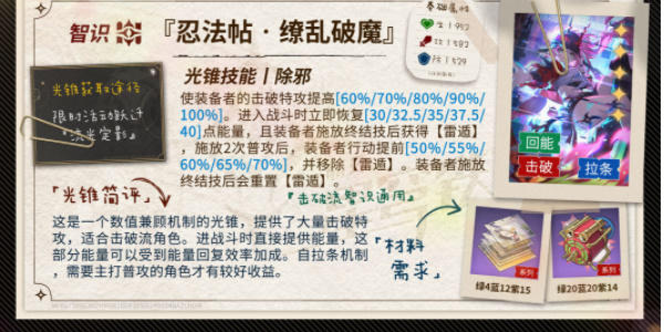 光锥效果:该光锥提供了大量击破特攻,且符合乱破的数值需求,进战斗时可以直接为乱破提供能量,部分能量可以受到能量回复效率加成,加快乱破开局启动的速度,并且提供了一个自拉条机制,加快循环速度,在敌人击破期内尽快打完爆发输出。