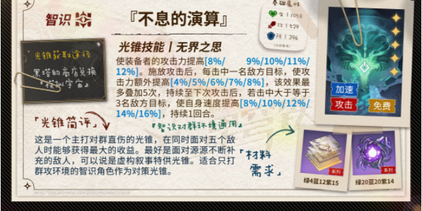 光锥效果:该光锥提供的是攻击力加成,场上敌人越多增益越高。此外还有只要对方有三个敌人就可以无缝维持的加速效果,虽然不提供击破增益,但攻击力和加速效果也还不错。