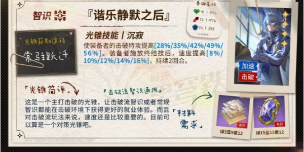 光锥效果:作为目前击破流智识的唯一四星光锥,满叠影时提供接近1叠专武的击破特攻,此外还有施放终结技后加速的效果,持续时间2回合是可以覆盖乱破的爆发期的,一定程度上能加快爆发期的出伤速度。