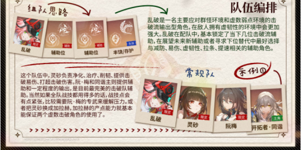 阵容思路:灵砂负责净化、治疗、削韧、提供击破易伤、打超击破伤害,阮·梅和同谐主则提供辅助和一定程度的输出,是目前最完美的击破队辅助。