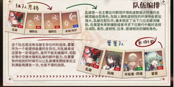阵容思路:当队伍是没有击破生存位时的选择,藿藿作为一个能提供能量的生存位,对乱破来说还是有一定增益效果,虽然不能无缝循环,但配合等价交换光锥和乱破的额外能力。