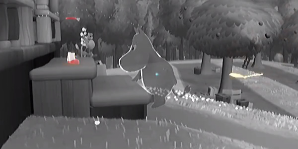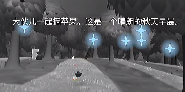 3、我们需要帮姆明一家摘苹果,寻着蓝色光点就能到苹果旁边把苹果摘下来,妮妮会把你摘下来的苹果捡进篮子里的。