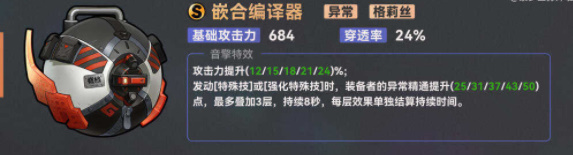 嵌合编译器的副词条为穿透率,满足柏妮思的需求,同时其技能能够提升所需的异常精通和攻击力,没有灼心摇壶的玩家可以将其作为备选方案。