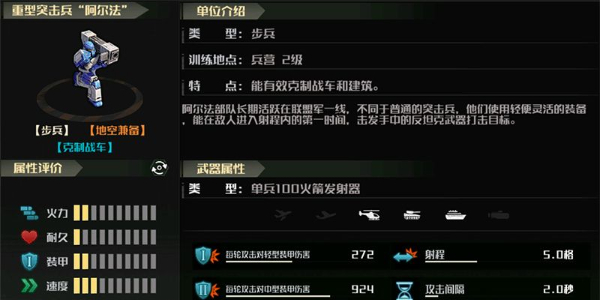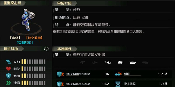 重型突击兵装备反坦克火箭筒,对敌方战车和建筑造成巨大伤害,关键是有防空能力,可以作为快攻主力。
