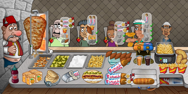 2、选择升级电刀来削烤肉,就变成自动化处理了,然后依次是土豆、自动饮料杯、继续升土豆、可乐机、卷饼、可乐杯,这样一套循环走下来,整个店的工作流程和操作顺序就非常不错了。