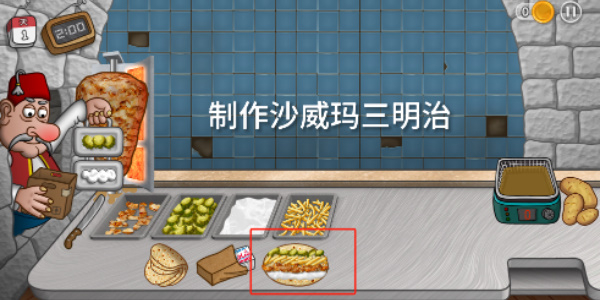 4、选择【饼皮】,将土豆削皮之后就能够将获得的土豆进行【油炸】,土豆油炸完成之后放入盘子里,之后切烤肉也是放在盘子里,接着将所有材料放在盘子里制作三明治,最后将制作好的三明治给顾客就可以了。