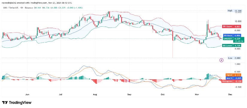 在6.00至6.20美元区间震荡数日后,UNI现货与期货市场的动能持续疲软。由于技术指标信号矛盾且缺乏决定性催化剂,该代币正处于盘整阶段,交易者正等待更明确的方向信号。